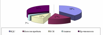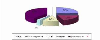 Рисунок 1.2.2 Структура поступления доходов в федеральный бюджет по видам налогов в 2008 г., %