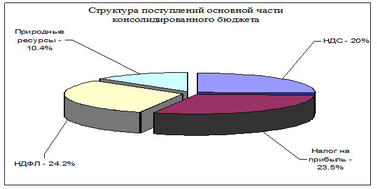 Основная часть доходов консолидированного бюджета сформирована за счет поступлений четырех видов налогов. Так, поступления налога на доходы физических лиц составили 7874,9 млн. рублей или 24,2% от общего объема поступлений, налога на добавленную стоимость – 6510,9 млн. рублей или 20,0%, налога на прибыль – 7657,4 млн. рублей или 23,5%, платежей за пользование природными ресурсами – 3372,5 млн. рублей или 10,4 процента. Перечисленные четыре вида налогов в совокупности обеспечили 25415,7 млн. рублей, или 78,1% от общего объема поступлений в консолидированный бюджет. (См. Приложение - Таблица 1).