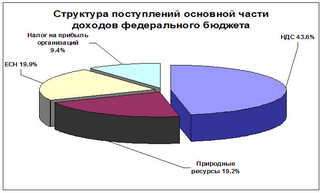 Основная доля поступлений федерального бюджета (92,1%) состоит из четырех видов налогов. Так, налог на добавленную стоимость обеспечил – 43,6% поступлений налогов и сборов в федеральный бюджет, единый социальный налог – 19,9%, платежи за пользование природными ресурсами – 19,2%, налог на прибыль организаций – 9,4 процента. (См. Приложение – Таблица 2).