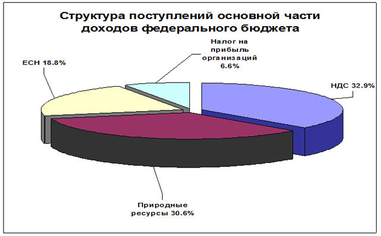 Основная доля поступлений федерального бюджета (88,9%) состоит из четырех видов налогов. Так, налог на добавленную стоимость обеспечил – 32,9% поступлений налогов и сборов в федеральный бюджет, платежи за пользование природными ресурсами – 30,6%, единый социальный налог – 18,8%, налог на прибыль организаций – 6,6 процента. (См. Приложение – Таблица 3)