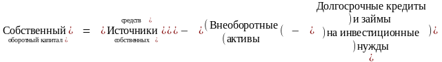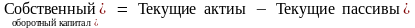2-й способ расчета. Этот способ основан на том, что источниками оборотных средств в данном варианте являются только собственный оборотный капитал и краткосрочная задолженность. Поэтому для определения величины собственного оборотного капитала необходимо из величины текущих активов (оборотных средств) вычесть величину текущих пассивов (краткосрочной задолженности). Таким образом, получим: