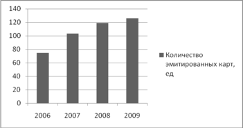 Количество кредитных карт, выданных, юридическим лицам, по сравнению с прошлым годом увеличилось на 10% и по состоянию на 1.12.09 составило более 0,1% от общего количества банковских карт.