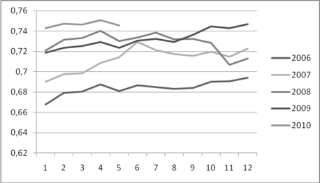 Если рассматривать каждый год в отдельности, то так же видна тенденция роста использования безналичных средств (рисунок 3). С каждым годом доля безналичных средств растет по отношению к предыдущим годам, исключением является только 2008 год в котором произошел значительный спад. Это можно объяснить финансовым кризисом 2008 года, когда первым признаком начинающегося кризиса в России стал понижающий тренд на российских фондовых рынках в конце мая 2008 года, который перешёл в обвал котировок в конце июля. Из графика видно, что первый спад в 2008 году был в мае. В октябре — ноябре 2008 года начался резкий спад промышленного производства, первая волна сокращений рабочих мест, кризис ликвидности в российских банках, резкое падение биржевых индексов РТС и ММВБ, падение цен на экспортную продукцию (сырьё и металл). В тоже время из рисунка 3 видно, что резкий спад произошел именно в октябре, это связано с тем, что на фоне падения мировых цен на сырье российские экспортноориентированные корпорации стали уводить заработанные активы за рубеж.