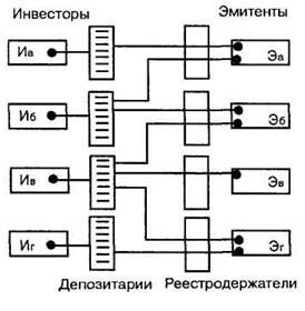 Это же распределение права собственности на ценные бумаги, с точки зрения реестродержателей, выглядит следующим образом. Ценные бумаги эмитента Эа принадлежат инвесторам Иа и Иб. Владельцами ценных бумаг эмитента Эб являются инвесторы Иб и Ив. Право собственности на ценные бумаги эмитента Эв принадлежит инвестору Ив. Ценные бумаги эмитента ЭГ находятся в собственности у инвесторов Ив и ИГ.