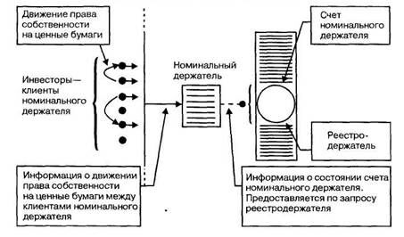 Номинальным держателем называется лицо, зарегистрированное в системе ведения реестра и не являющееся владельцем в отношении этих ценных бумаг. При этом номинальный держатель ценных бумаг может осуществлять права, закрепленные ценной бумагой, только в случае получения соответствующего полномочия от владельца. Операции с ценными бумагами между владельцами ценных бумаг одного номинального держателя ценных бумаг не отражаются у реестродержателя. Это особенно удобно при организации работы торговой системы, когда перерегистрация права собственности на ценные бумаги по результатам сделок, заключенных в торговой системе, осуществляется у номинального держателя, обслуживающего торговую площадку, а не у реестродержателя, ведущего реестр акционеров эмитента (рис. 1.2).