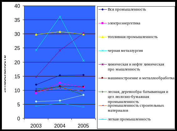 Следующим этапом будет анализ рентабельности предприятий (табл. 2.6 и рис 2.2). По данным диаграммы можно сказать, что средняя рентабельность предприятий на уровне 15 %, при этом сформирована она за счет топливной, химической и нефтехимической промышленности и черной металлургии. Кроме того, следует отметить, что рентабельность черной металлургии имеет тенденцию к снижению, следовательно, возможно снижение общей рентабельности в промышленности. Сопоставив рис 2.2 и табл. 2.5 можно отметить, что предприятия энергетики при рентабельности ниже среднего уровня приносят 30 % всей прибыли, это говорит о том, что необходимо привлекать инвестиции для снижения себестоимости продукции (следует разграничить субсидии и инвестиции).