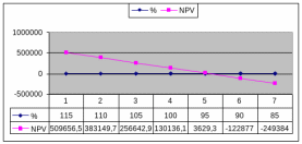 | NPV | 509656,5 | 383149,7 | 256642,9 | 130136,1 | 3629,3 | -122877 | -249384 |