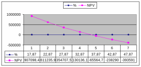| NPV | 907098,4 | 611235,9 | 354707,5 | 130136,1 | -65564,7 | -238290 | -393591 |