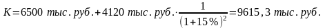 Первоначальные капиталовложения в производство (6500 тыс. руб.) осуществлялись в нулевом году, они не нуждаются в дисконтировании. Остальные капиталовложения (4120 тыс. руб.) были инвестированы во втором году деятельности предприятия и нуждаются в дисконтировании: