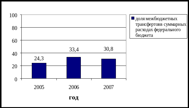 Межбюджетные трансферты из федерального бюджета субъектам Российской Федерации являются одним из основных элементов системы межбюджетных отношений. Их доля в 2006-2007 г.г. составляет более 30% всех расходов федерального бюджета, в то время как в 2005 году их доля составляла 24,3% (Рис.2.2).