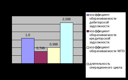 Длительность операционного цикла равна 2,6, т.е. 3 дня требуется для производства продукции и оплаты продукции.