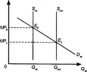 Первоначальная кривая предложения денег – Sm. Предложение денег не является функцией ценности денег, а определяется решением властей. Если власти увеличивают предложение денег Sm, a спрос на деньги Dm остается неизменным, то возникает избыточная денежная масса при прежнем уровне цен. Те, кто принимает экономические решения, будут тратить этот избыток до тех пор, пока уровень цен не поднимется достаточно для того, чтобы побудить население держать новый объем денежной массы. Новой равновесной точкой окажется E1, которая отражает случившийся рост ценового уровня и, следовательно, падение покупательной способности денег до 1/P1.
