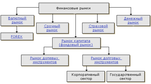 Понятие финансового рынка настолько многогранно, что без разделения его на сегменты понять принципы его функционирования невозможно. Для более наглядного отображения понятия «финансовый рынок» ниже представлена схема 1, иллюстрирующая общее строение финансовых рынков.