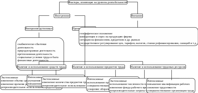 Внепроизводственные факторы включают в себя снабженческо-сбытовую деятельность, т.е. своевременность и полноту выполнения поставщиками и покупателями обязательств перед предприятием, их удаленность от предприятия, стоимость транспортировки до места назначения и т.д.. Природоохранные мероприятия, которые необходимы для предприятий ряда отраслей, например, химической, машиностроительной и т.д. отраслей, и влекут за собой значительные издержки. Штрафы и санкции за несвоевременность или не точность выполнения каких-либо обязательств фирмы, например, штрафы в налоговые органы за несвоевременность расчетов с бюджетом. На финансовые результаты деятельности фирмы, а следовательно и на рентабельность косвенно влияют и социальные условия труда и быта работников. Финансовая деятельность предприятия, т.е. управление собственным и заемным капиталом на предприятие, деятельность на рынке ценных бумаг, участие в других предприятиях и т.д.