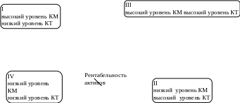 Используя формулу (19) на практике предприятие может регулировать уровень рентабельности активов изменяя ее составляющие коммерческую маржу и коэффициент трансформации. На величину коммерческой маржи влияют такие факторы, как ценовая политика, объем и структура затрат и т.д. На коэффициент трансформации отрасль (например, в торговле оборачиваемость активов больше, чем в машиностроение) и экономическая стратегия предприятия. На практике невозможно обеспечить одновременный рост КМ и КТ, т.к. показатель оборота присутствует одновременно в знаменателе одного сомножителя и в числителе другого. По этому, важно решить вопрос, какой из показателей оказывает более сильное воздействие на изменение рентабельности активов. В зависимости от уровня показателей КМ и КТ можно выделить четыре варианта их комбинации (рисунок 4)
