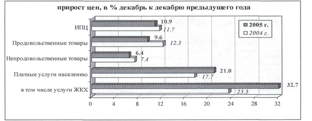 На опережающих темпах инфляции также сказался повышенный рост административных тарифов в начале года, вдвое превышавший аналогичные прошлогодние показатели, связанный с принятием решения о переходе населения на 100% оплату услуг ЖКХ; сокращением дотаций из федерального бюджета; более значительным, чем в 2004 году, повышением регулируемых цен на отпускаемые для населения энергоносители естественными монополиями (оптовые цены газ с 1 января были увеличены на 25.1%, предельный размер повышения тарифов на электроэнергию был повышен также до 25%) с целью сокращения перекрестного субсидирования последних