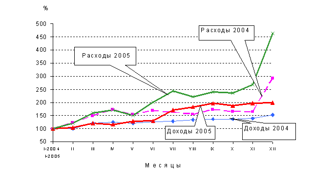 Динамика доходов и расходов республиканского бюджета представлена на рис. 3.1. Суть данных расчетов заключается в том, что ежемесячные показатели доходов и расходов в январе принимаются за 100%, а по отношению к ним рассчитываются темпы прироста (падения) доходов и расходов ежемесячных показателей последующих месяцев, определяя таким образом величину бюджетной напряженности. Величина бюджетной напряженности зависит от расхождения кривых доходов и расходов. Как видно из рисунка, лезвия бюджетных «ножниц» в декабре 2005 года «раскрылись», что говорит о наличии бюджетной напряженности в конце года - если в ноябре 2005 года дефицит номинальных ежемесячных показателей составлял 69,4 процентного пункта, то в декабре – уже 267,4 п.п. На графике, иллюстрирующем динамический ряд ежемесячных темпов роста номинальных доходов и расходов за период 2004–2005 гг., наблюдается ситуация, когда при незначительной (0,6%) среднемесячной инфляции в 2005 году темпы роста номинальных доходов и расходов растут значительно, в частности, начиная с мая-июня 2005 года.