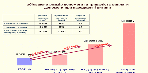 Вперше у 2008 році запроваджено допомогу при народженні дитини в залежності від кількості дітей в сім’ї. Така допомога збільшилася в 1,4 рази для першої дитини; для другої дитини - у 2,9 рази; для третьої та наступної у 5,9 разів (Рис 2.1)