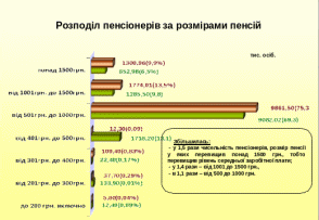 Рис. 2.10. Розподіл пенсіонерів за розмірами пенсій, тис. осіб.