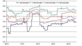 В первую очередь роста ставок происходил в коротком секторе, основной причиной которого стали, по нашему мнению, высокие ставки на рынке МБК, которые практически не опускались ниже 2% годовых, а их верхняя граница колебалась на уровне в среднем 4-5% годовых. Определенную поддержку российскому долговому рынку и долгосрочному сектору векселей оказывало относительно высокая рублевая ликвидность и укрепление рубля. Однако в мае укрепление рубля остановилось, на мировом рынке возросли опасения дальнейшего повышения доходности вслед за продолжением цикла повышения учетной ставки ФРС США, ожидаемой многими инвесторами паузы так и не было взято монетарными властями США. Результатом этого стало ускорение темпов роста доходности на вексельном рынке во всех секторах. На конец июля доходность годового индекса «RUX-РЕГИОН», которые отражают среднюю доходность наиболее ликвидных банковских векселей, достиг уровня 8,2-8,4% годовых против его минимальных в первой половине года отметки на уровне 7,6-7,7% годовых. Трех- и шестимесячные вексельные индексы вросли на 60-70 б.п. до 7,5-7,9% годовых. Самый краткосрочный (один месяц) индекс после снижения до 6,1-6,2% в феврале-марте к концу июня вырос до 7,0-7,1% годовых.