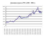 При этом, по оценкам инвесторов, инвестиционный климат в России улучшался, как вследствие наступления политической и макроэкономической стабилизации, так и вследствие развития финансовой индустрии и финансового законодательства. Как следствие – сокращался разрыв между уровнями показателя P/E российских акций и акций компаний прочих развивающихся рынков. В 2004 году произошло торможение биржевой динамики российского рынка акций, который в течение 3 лет подряд был одним из самых доходных (быстрорастущих) рынков в мире. Индекс РТС вырос в 2001 году на 81%, в 2002 году на 38%, в 2003 году на 58% (рис. 1). Тем не менее, отмечавшийся рост был, скорее, следствием роста капитализации российского рынка акций, при сохранении среднего уровня биржевых оборотов. Эта тенденция «стагнации» биржевой динамики стала особенно заметна в 2004 году, когда капитализация фондового рынка значительно снизилась.