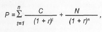 Как общее правило, значение купона объявляется в расчете на год, однако выплачиваться он может и чаще - раз в полгода, квартал. Если в нашем примере купон составляет 200 тыс. за год, то в случае его выплаты два раза в год инвестор будет получать по 100 тыс. каждые полгода; если купон выплачивается ежеквартально, то сумма каждого платежа составит 50 тыс. Курсовая стоимость купонной облигации определяется по формуле