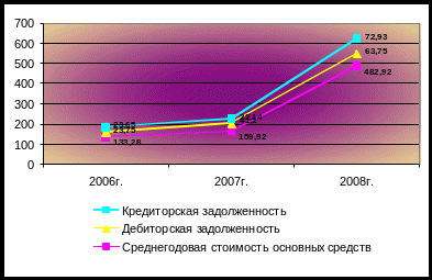 Рассматривая эти данные, с точки зрения полезности для предприятия, мы видим, что произошли определенные негативные изменения в структуре краткосрочных обязательств. Раньше фирма покрывала свои потребности в заемных средствах, за счет источников, которые были практически бесплатны. В 2006г. 57,25%, а в 2007г. 55,7% покрывали авансовые платежи и 39,7% и 41,5% соответственно сумы расчетов по товарам, не оплаченным в срок. Но в течение 2008г. ситуация изменилась. Лишившись такого источника, как авансовые платежи фирма была вынуждена взять кредит в размере 50000 грн. (или 40,67%) для покрытия недостатка оборотных средств. Задолженность по нетоварным операциям увеличилась по сравнению с прошлым годом на 63,17%, за счет увеличения размера заработной платы. Сумма задолженности кредиторам на товары неоплаченные в срок возросла на 13,04%. Это свидетельствует о недостатке свободных ДС на расчетном счете предприятия.