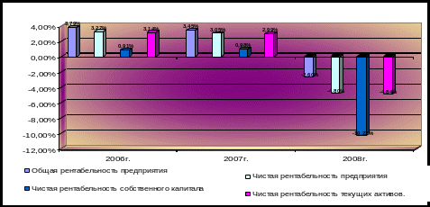 Следовательно, период оборота увеличился на 113 дней в сравнении с 2007г. и на 140 по сравнению с 2006г. Делая оценку показателей рентабельности и эффективности управления, мы видим, что в 2008г. они имеют отрицательные значения. Это связано с тем, что вместо ожидаемой прибыли фирма получила убыток.