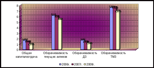 Делая общее заключение по этому подразделу, мы снова видим, что расчетные данные подтверждают вывод об ухудшении ФСП. Так, не рассматриваемый ранее, коэффициент общей капиталоотдачи свидетельствует о том, что период оборота имущества предприятия составил 355 дней, в то время как аналогичный показатель за прошлый год был равен 242 дням, а в 2006г. был еще меньше.