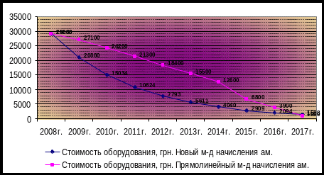 Рис. 3.1 - Изменения стоимости оборудования при новом и прямолинейном методе начисления амортизации