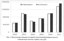 Уровень налоговой нагрузки на сельскохозяйственных товаропроизводителей заметно снизился. Однако за 2004-2007 гг. объем поступлений единого сельскохозяйственного налога увеличился в 2,7 раза (рис. 1).