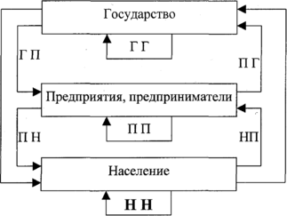 За каждой из указанной на схеме стрелок стоит множество разнообразных финансовых связей, потоков, отношений. Основываясь на общей схеме финансовых потоков между экономическими агентами, рассмотрим отдельные, наиболее представительные связи и финансовые отношения на разных уровнях. К ним относятся: "государство-предприятие" (ГП), "предприятие-государство" (ПГ), "государство-государство" (ГГ), "предприятие-население" (ПН), "население-государство" (НГ), "население-предприятие" (НП), "предприятие-предприятие" (ПП), "население-население" (НН), "государство-население" (ГН). Связь "государство-государство" характеризует перераспределение, переток денежных средств из одних каналов государственного бюджета в другие. Связь "предприятие-предприятие" отражает финансовые потоки между предприятиями, а связь "население-население" определяет движение денежных средств между отдельными группами населения.
