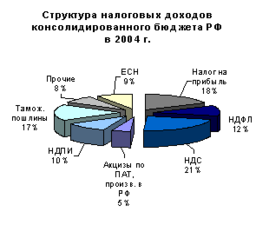 Как видно из рисунков, в структуре налоговых доходов консолидированного бюджета наибольшую долю в 2004 г. занимали поступления от НДС, налога на прибыль организаций и таможенных пошлин (21%, 18% соответственно). При этом более чем на 60% налоговая часть федерального бюджета формировалась за счет НДС и таможенных пошлин. Суммы поступлений от налога на прибыль организаций и НДПИ обеспечивали еще 20% налоговых доходов.