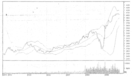 Например, на основании динамики курса евро строится канал изменения исторической волатильности, за пределы которого курс не может выходить с 95% вероятностью. Кроме того, график курса евро сглаживается графиком скользящей средней, на основании которого строится канал волатильности.