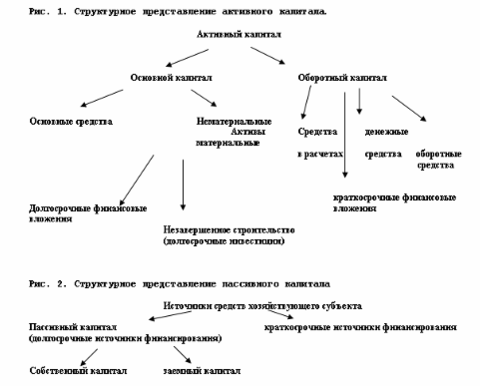 Соответственно выделяют две взаимосвязанные разновидности капитала: активный и пассивный капиталы. Активный капитал — это производственные мощности хозяйствующего субъекта, формально представленные в активе его бухгалтерского баланса в виде двух блоков — основного и оборотного капиталов (рис..1). Пассивный капитал — это долгосрочные источники средств, за счет которых сформированы активы субъекта; они подразделяются на собственный и заемный капиталы3 (см. рис..2).