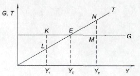 Связь между государственными расходами и налоговыми поступлениями в казну можно показать графически. Государственные расходы на текущий год есть величина постоянная, не зависящая от объема национального дохода. Поэтому кривая государственных расходов G будет иметь вид горизонтальной прямой (рис. 3.2). Сумма налогов, получаемых государством, пропорциональна объему национального дохода. Соответственно, кривая налоговых поступлений Т будет восходящей.
