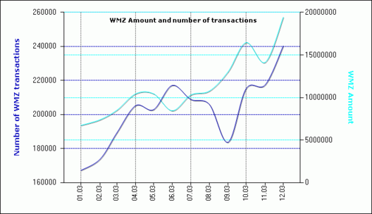 На втором графике отображены те же показатели: количество операций и обороты по месяцам применительно к WMZ - WebMoney, выраженных в долларах США. Что удивительно, но годовой оборот по WMZ намного превысил рублёвый. Вот итоговые годовые цифры: