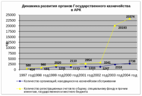 За короткое время существования казначейская система доказала свою эффективность и необходимость, а объемы стоящих перед ней задач неизмеримо возросли. Если в 1997 году на казначейском обслуживании в Крыму находилось 414 организации, которым было открыто 580 регистрационных счетов, а объем платежных поручений по оплате счетов за год составлял 55,3 тыс.шт.. По состоянию на 1 января 2005 года на казначейском обслуживании находилось 2738 организации, в том числе 930 распорядителей средств государственного бюджета, 1146 распорядителей и получателей средств местных бюджетов и 662 прочих клиентов, что больше более чем в 6 раз количества организаций, которые обслуживались в органами казначейства в АРК в 1997 году. Количество счетов открытых на их имя в казначействе увеличилось в 40 раз и составляет 23374, количество платежных поручений за 2004 год в сравнении с 1997 годом увеличилась в 38 раз и превысила 2 миллиона штук. (Приложение 1).