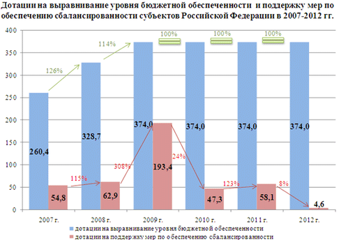 Значительное снижение объема средств на поддержку мер по обеспечению сбалансированности бюджетов субъектов Российской Федерации в 2010-2012 годах к уровню 2009 года связано с тем, что в федеральном бюджете 2009 года в качестве антикризисной меры дополнительно были предусмотрены дотации на поддержку мер по обеспечению сбалансированности субъектов Российской Федерации в сумме 150 млрд. рублей. Это позволило оказать нуждающимся субъектам Российской Федерации необходимую финансовую помощь, а регионам - своевременно выполнить свои обязательства.