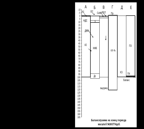 Шесть перечисленных колонок А, Б, В, Г, Д, Е располагаются в горизонтальной плоскости балансограммы, в вертикальной плоскости балансограммы изображена в порядке возрастания сверху вниз процентная или денежная (рублевая) шкала. Наиболее удобной при проведении комплексной оценки финансового состояния предприятия, сравнительного анализа показателей финансового состояния за несколько периодов и оценке вариантов при разработке финансовой стратегии является процентная шкала. В этом случае, для получения абсолютных значений излишка или недостатка финансовых ресурсов предприятия в рублевом эквиваленте, рассчитывается масштаб балансограммы на начало и конец анализируемого периода.