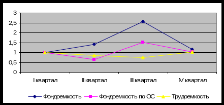 Рис. 2.4 Динамика фондоемкости оборотных средств, основных средств и трудоемкости