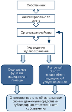 Учреждения здравоохранения решают социальную функцию оказания медицинской помощи целевой группе в рамках сметного финансирования, а с разрешения органа управления здравоохранения занимаются медицинским бизнесом (оказанием платных медицинских услуг) в рамках товарообмена медицинских услуг на денежные средства с зачислением их на лицевые счета органов Федерального казначейства.