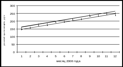 Из данного графика видно, что существует ценовой канал, который отражает колебание цены внутри месяца. Линия тренда направленная вверх, что говорит нам о постоянном повышении цены. По графику также можно увидеть, что цена в декабре находится ниже линии тренда. Цена акции в декабре выходит за рамки тренда и это свидетельствует о том, что в январе-феврале следующего года можно ожидать падение стоимости акции.