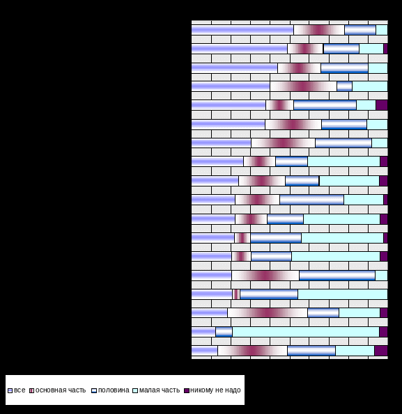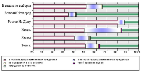 Так, около полвины (50,6%) респондентов считает, что ФЗ «О государственной поддержке малого предпринимательства в Российской Федерации» нуждается в значительных изменениях. При этом в Ростове-на-Дону такой позиции придерживаются 80% опрошенных субъектов малого предпринимательства. Наименее радикальные предприниматели в Великом Новгороде – лишь 33% предпринимателей придерживаются такой позиции (при условии, что 59,2% опрошенных затруднились ответить). В таком случае интересно отметить, что из предпринимателей хорошо знакомых с содержанием Федерального закона (их количество составило 16% от общей массы предпринимателей) 72% считает, что Закон нуждается в значительных изменениях.
