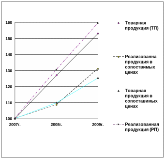 Для того чтобы наглядно представить изменение показателей деятельности предприятия в динамике за 2007-2009г.г. по рассчитанным темпам роста, построим их графическое изображение. В первую очередь рассмотрим данные о производстве и реализации продукции (рис 1).