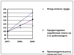 Анализируя вышеперечисленные показатели можно отметить тенденцию роста их величины. Так, фонд оплаты труда увеличился с 6247тыс. руб. в 2007году до 9469,0 тыс. руб.; то есть вырос в 1,5 раза, причем прирост среднесписочной численности работающих составил 42 человека или 15,5% к базисному году. Значительное увеличение фонда оплаты труда при относительно небольшом увеличении численности работающих привело к росту среднегодовой заработной платы с 23,2 руб. в 2004 году до 30,4 руб. То есть за рассматриваемый период заработная плата работающих увеличилась на 31,3%.
