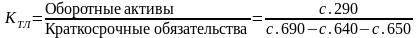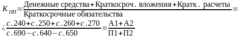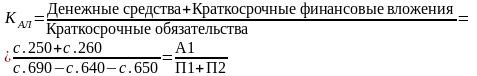 Показывает возможность немедленного погашения краткосрочных обязательств. Наибольший интерес вызывает у поставщиков. Теоретически достаточное значение в следующих пределах 0,2; 0,25.