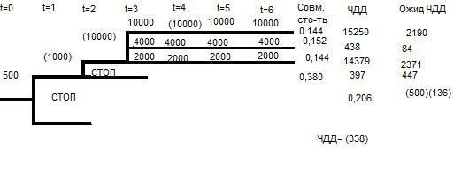 В результате построения дерева решений определяется вероятность каждого сценария развития проекта, эффективность по каждому сценарию, а также интегральная эффективность проекта. Положительная величина показателя эффективности проекта (например, чистого дисконтированного дохода) указывает на приемлемую степень рисков, связанного с осуществлением проекта.
