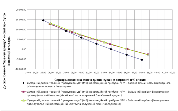 Рис. 2.4. Результати оцінки чутливості дисконтованого прибутку інвестиції NPV до зміни ефективної бар’єрної ставки дисконтування для 3-х варіантів фінансування проекту експлуатації міні-гольф клубу