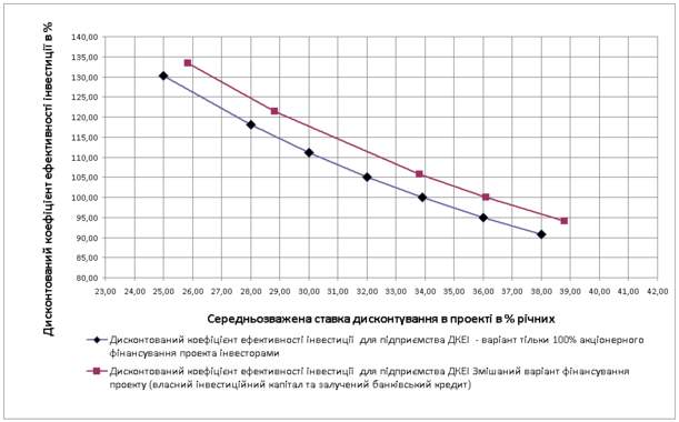 Для оцінки чутливості показників ефективності проекту до зміни параметрів реалізації фінансування проекту та зовнішніх факторів для всіх 3-х варіантів проекту були проведені тестові розрахунки оцінки впливу зміни бар’єрної ставки дисконтування (прогнозне очікування економічної ефективності проекту в часі) на основні дисконтовані показники ефективності проекту (Додатки Б, В, Г).